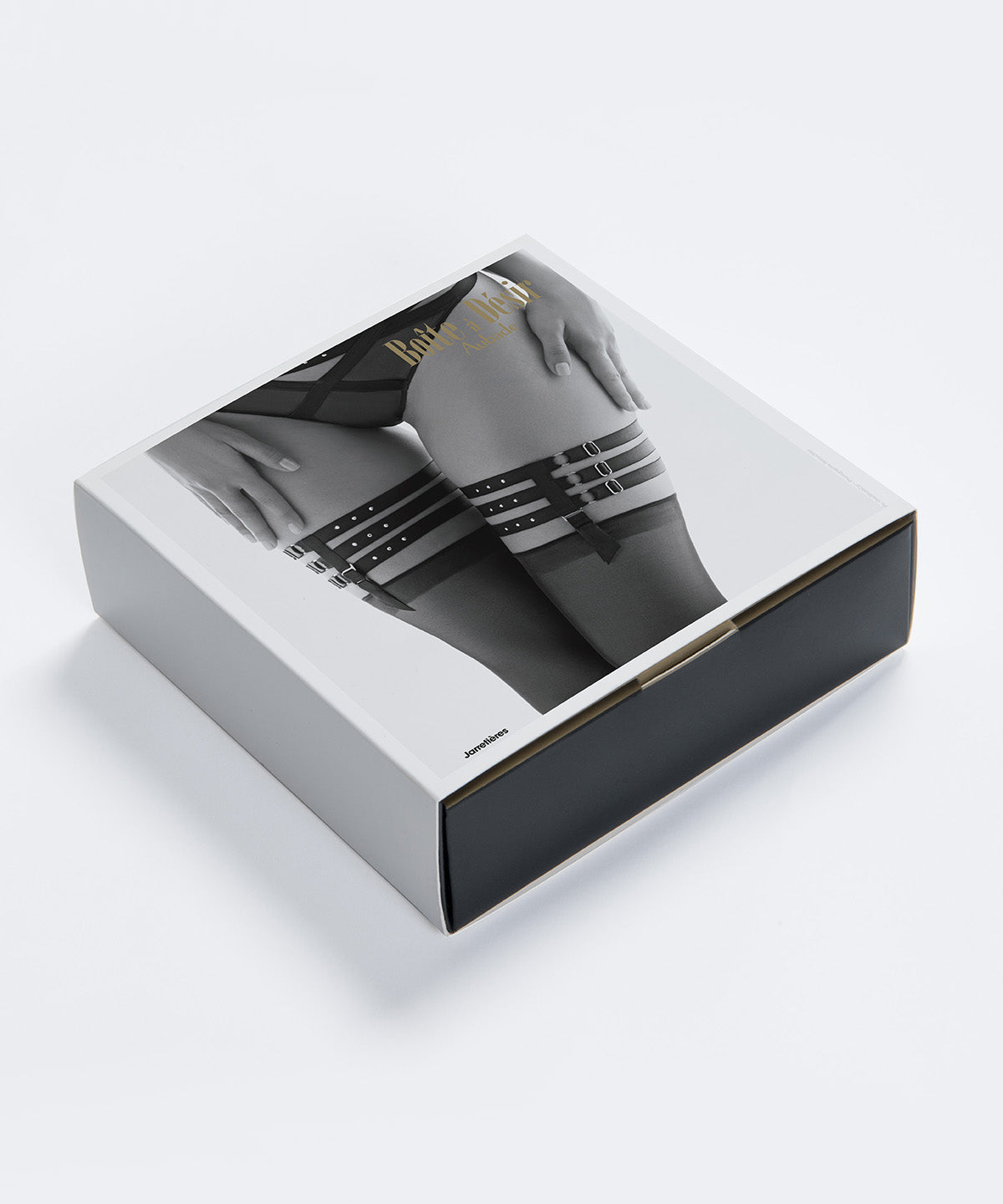 A must-have piece of charming lingerie, the garter from the Rencontre Anonyme capsule is erotic as well as chic. Held prisoner in cheeky straps with a sensual feel, the leg is adorned with studded details and pink gold rings, catching the eye with its transparent and sexy look.