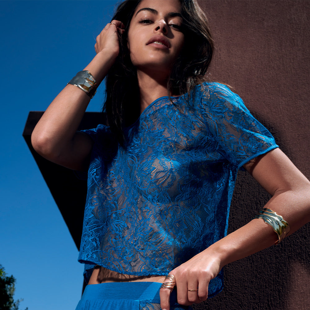 - Fine and delicate floral embroidery contrasting with graphic and modern edging