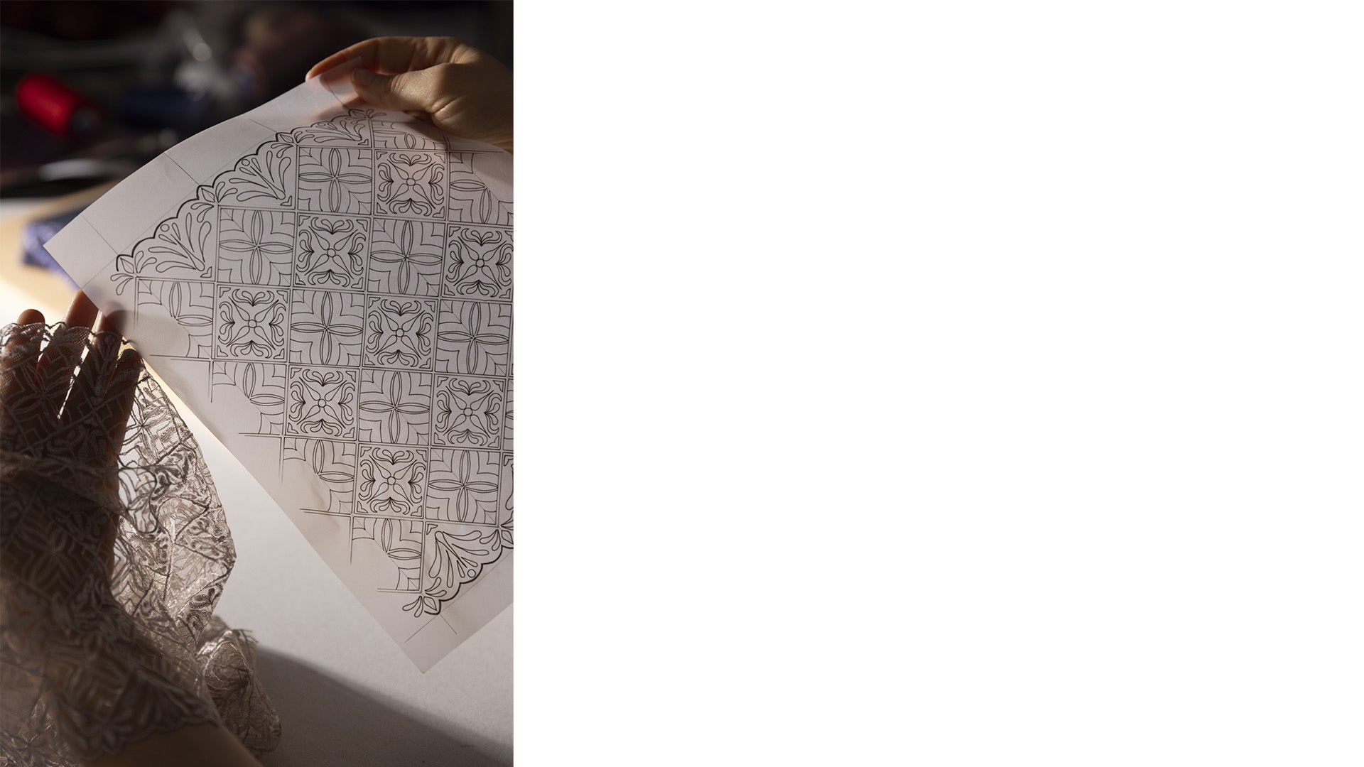 Calais Leavers lace, with its refined geometric motifs, sculpts the silhouette with a delicate precision. It meets an airy Italian point-d’esprit, adding both depth and lightness to the line. The expertise lies in this interplay of materials, designed to embrace the curves with effortless grace.